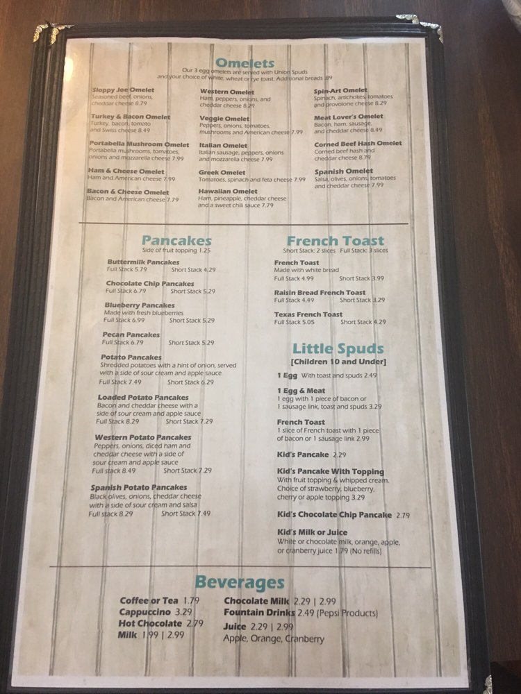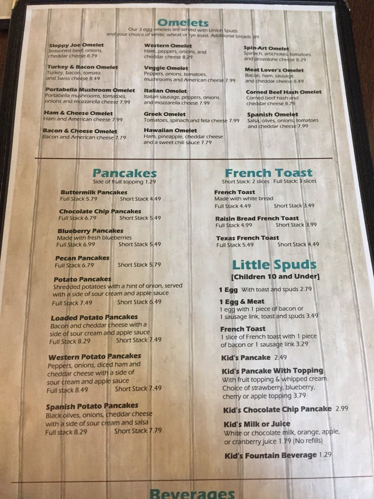Mama's Lor's favorite. 2 French toast, 2 eggs, 2 bacon, 2 sausage and spuds.