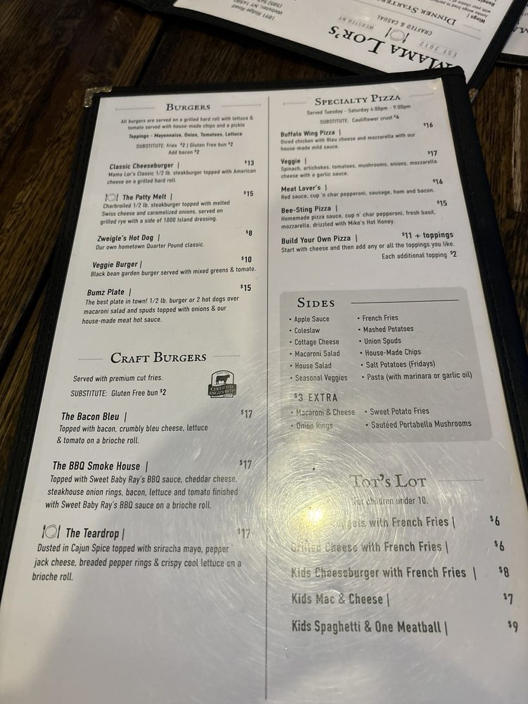 Mama's Lor's favorite. 2 eggs atop a ground chuck burger, topped with Mama's homemade meat sauce, onion, and American cheese and served over spuds.