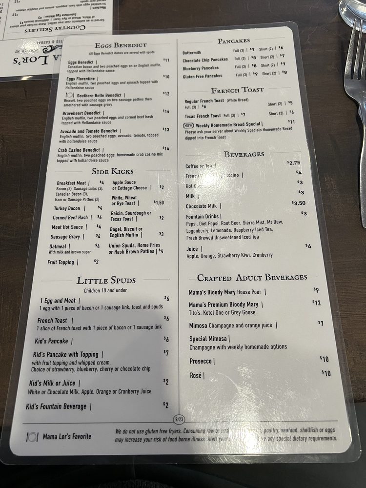 Mama's Lor's favorite. 2 eggs scrambled over spuds, topped with sausage gravy and served with toast.